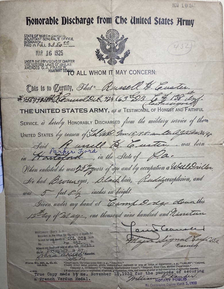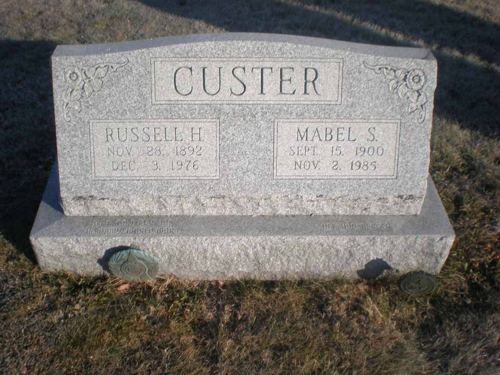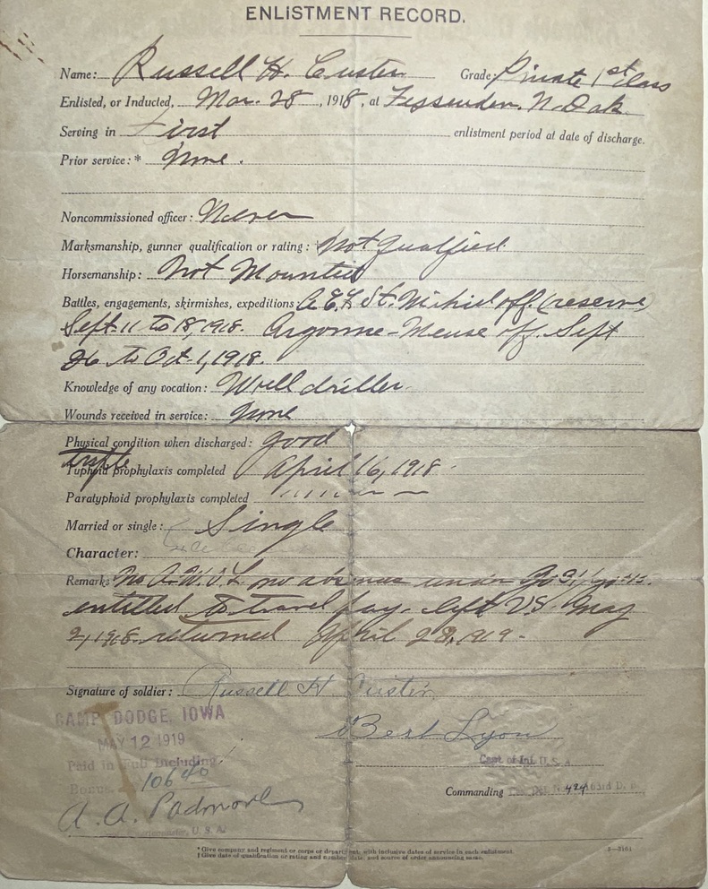 At the start of the first World War, Russell was living in North Dakota and working as a well driller. On March 28, 1918, at the age of 26, he enlisted at Camp Dodge in Iowa. His enlistment paperwork describes him as having brown eyes, black hair, a ruddy complexion, and standing 5′ 8.5″ tall. His father, Abraham Lincoln Custer, was listed as next of kin, and living at 518 Staubridge St in Morrisstown, PA (an address which no longer seems to exist).
