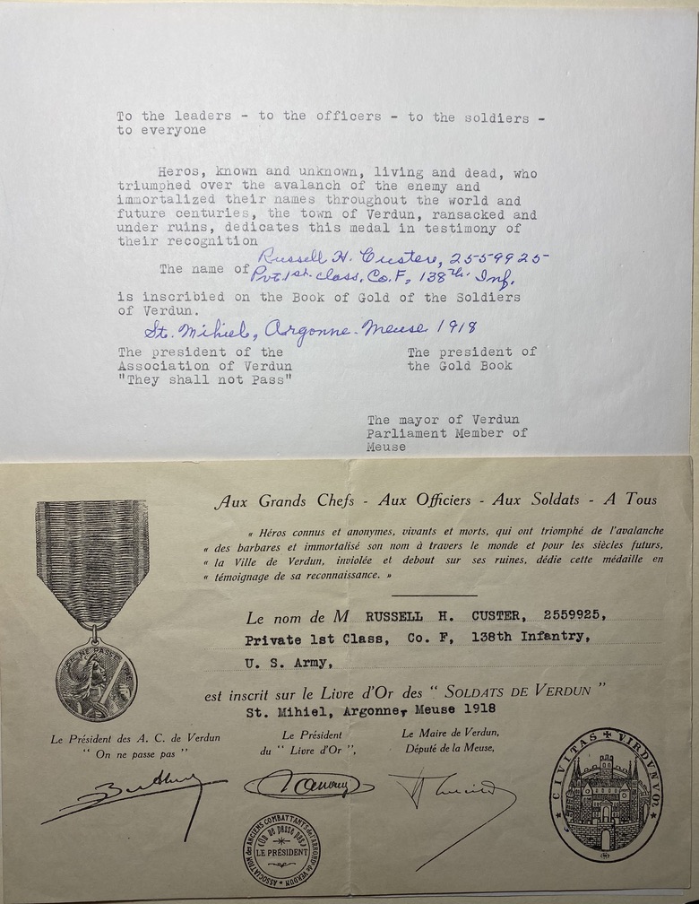 In thanks for his service, Russell later received a medal from the French government, as well as a letter stating that his name was “inscribed on the Book of Gold of the Soldiers of Verdun.” The letter is signed by the President of the Association of Verdun, the President of the Gold Book, and the mayor of Verdun, Parliament member of the House.