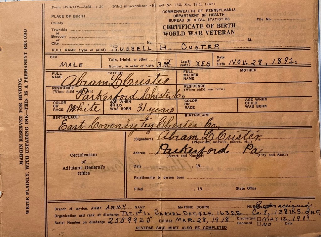Russell Custer was born on November 28, 1892 in Parker Ford, Chester County, Pennsylvania.