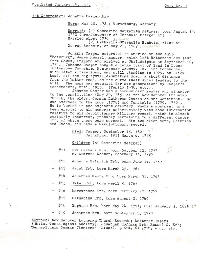 1? Johannes Jacob (1756-1810) is not listed in the genealogy document above, but comes up on Ancestry where he is listed as living in Lancaster, PA. It is possible that he may have been part of a different Erb family.