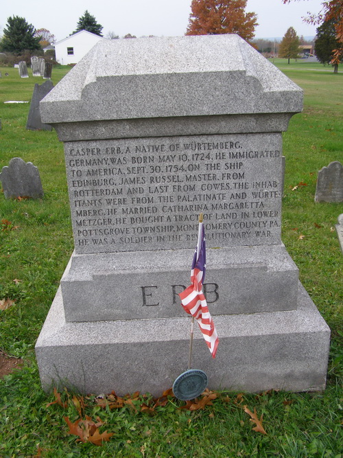 Casper and his first wife are buried at New Hanover Lutheran Church, the oldest German Lutheran church in North America. Its cemetery boasts dozens of headstones with the name Erb. Casper seems to have been given a greatly upgraded headstone years after his death, including details of his life and military career. However, the genealogy provided above casts doubt upon his purported military involvement, and I have honestly not found any records indicating that this Casper was indeed involved in the War for Independence.