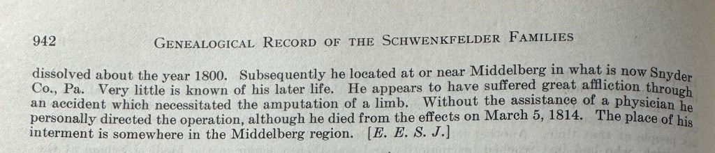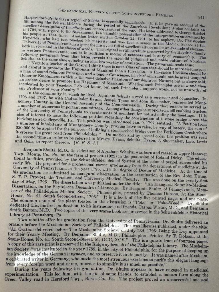 Benjamin Schultz was born on July 20, 1772 and died on March 5, 1814. He graduated from the department of medicine at the University of Pennsylvania in 1795 with a Doctor of Medicine degree. According to the Genealogical Record, he suffered an accident which required the removal of a limb and, “without the assistance of a physician he personally directed the operation, although he died from the effects…” His place of burial is purported to be near where he lived in the Middelberg region. According to Find-a-Grave, a book was written by him: “An Account of Dr. Benjamin Schultz of Pa.: Physician, Botanist and Philosopher 1772-1814,” by Andrew S. Berky