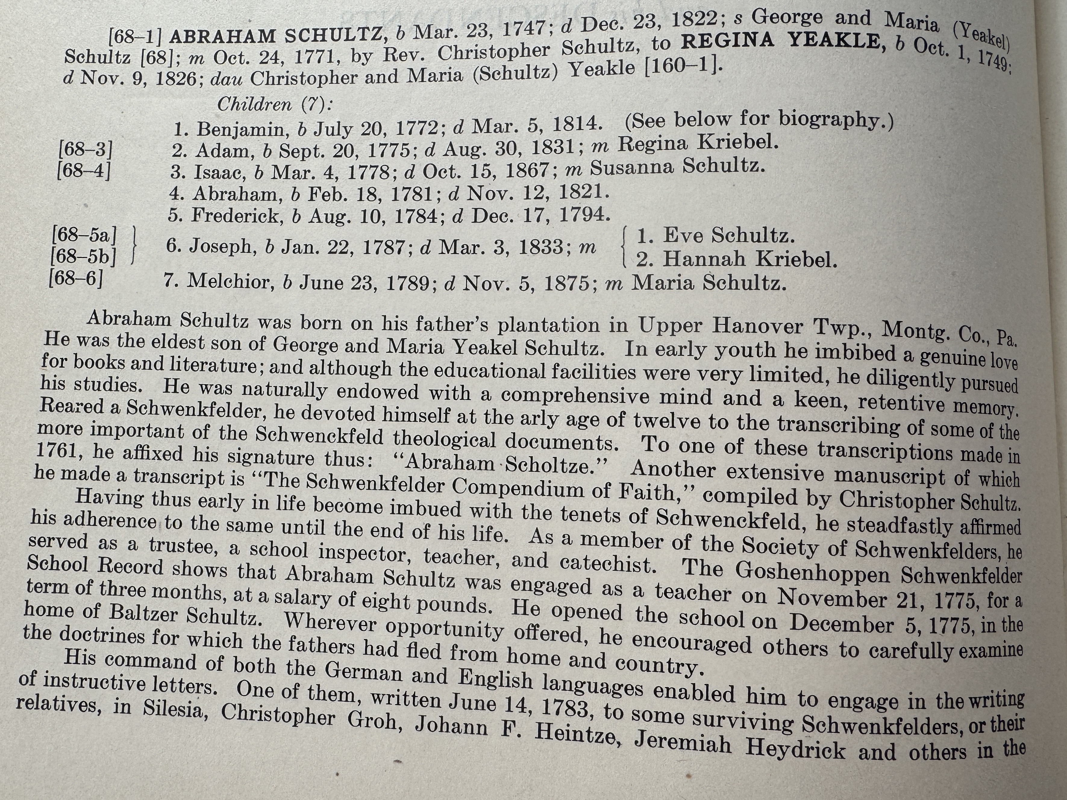 Abraham was the oldest child of George and Maria Schultz, and first generation of the line born in Pennsylvania. He was born on his father’s plantation in Upper Hanover, Montgomery County. He married Regina Yeakel, and the couple had six children. Both are buried at the Washington Schwenkfelder Cemetery.