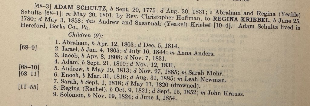 Adam Schultz, son of Abraham, was born Sept. 20, 1775, in Upper Hanover township, Montgomery Co., Pa., and died Aug. 30, 1831, of typhoid fever, on his farm near Treichlersville, in Hereford township. His two sons died but a short time afterward, of the same disease. He owned 160 acres there, where the sawmill is located, and engaged in both farming and sawmilling, likewise operating a distillery, making apple-jack and rye whiskey. He also owned 214 acres in Washington township, now owned by Mary Ann Schultz. Like all his family, he was a Schwenkfelder in religious faith. On May 21, 1801, Mr. Schultz married Regina Kriebel, born June 25, 1780, daughter of Andrew Kreibel, died May 3, 1858. They had children as follows: Abraham, born April 12, 1803 (died Dec. 5, 1814); Israel, June 4, 1805; Jesse, April 8, 1808 (died Nov. 7, 1831); Adam, Sept. 21, 1810 (died Nov. 12, 1831); Andrew, May 19, 1813; Enoch K., March 31, 1816; Sarah, Sept. 1, 1818 (was drowned May 11, 1820); Regina, Oct. 9, 1821; and Solomon, Nov. 9, 1824 (died June 4, 1854, at St. Paul, Minn., and his remains were sent to Clayton, Pa., and interred at the Washington Meeting-house).