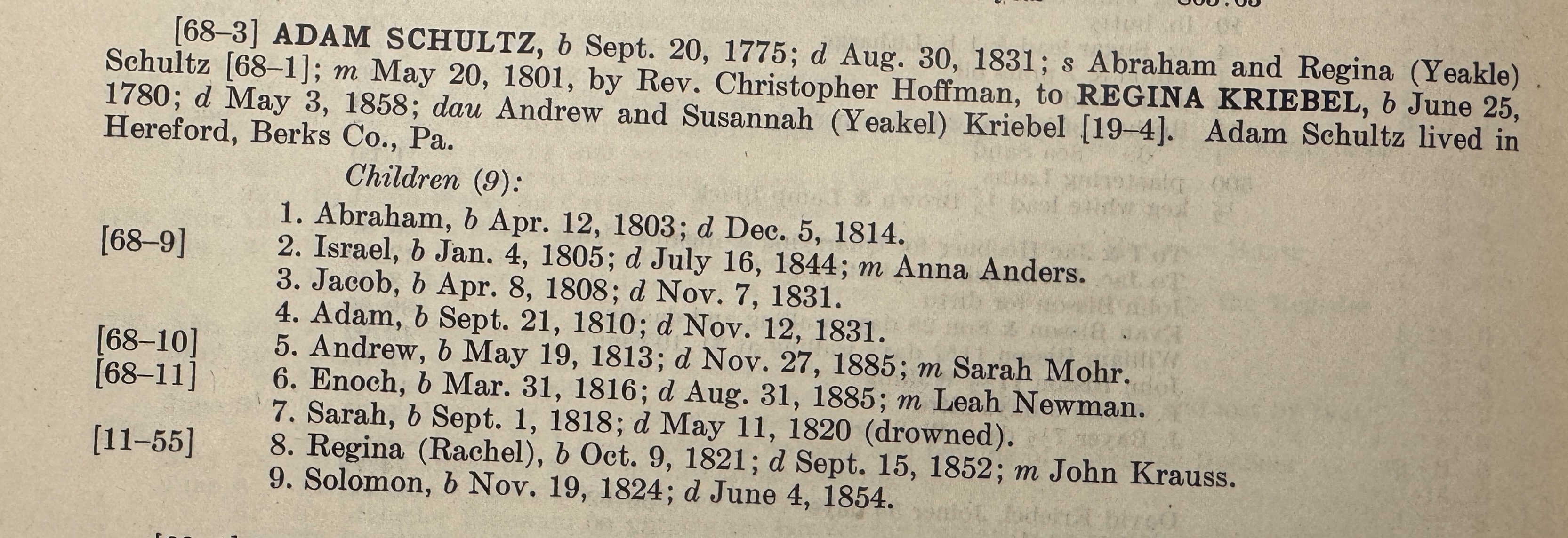 Adam Schultz, son of Abraham, was born Sept. 20, 1775, in Upper Hanover township, Montgomery Co., Pa., and died Aug. 30, 1831, of typhoid fever, on his farm near Treichlersville, in Hereford township. His two sons died but a short time afterward, of the same disease. He owned 160 acres there, where the sawmill is located, and engaged in both farming and sawmilling, likewise operating a distillery, making apple-jack and rye whiskey. He also owned 214 acres in Washington township, now owned by Mary Ann Schultz. Like all his family, he was a Schwenkfelder in religious faith. On May 21, 1801, Mr. Schultz married Regina Kriebel, born June 25, 1780, daughter of Andrew Kreibel, died May 3, 1858. They had children as follows: Abraham, born April 12, 1803 (died Dec. 5, 1814); Israel, June 4, 1805; Jesse, April 8, 1808 (died Nov. 7, 1831); Adam, Sept. 21, 1810 (died Nov. 12, 1831); Andrew, May 19, 1813; Enoch K., March 31, 1816; Sarah, Sept. 1, 1818 (was drowned May 11, 1820); Regina, Oct. 9, 1821; and Solomon, Nov. 9, 1824 (died June 4, 1854, at St. Paul, Minn., and his remains were sent to Clayton, Pa., and interred at the Washington Meeting-house).