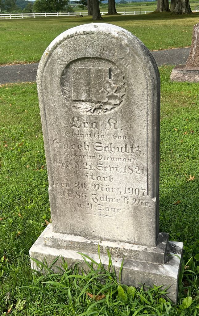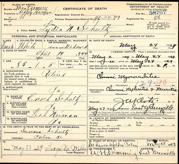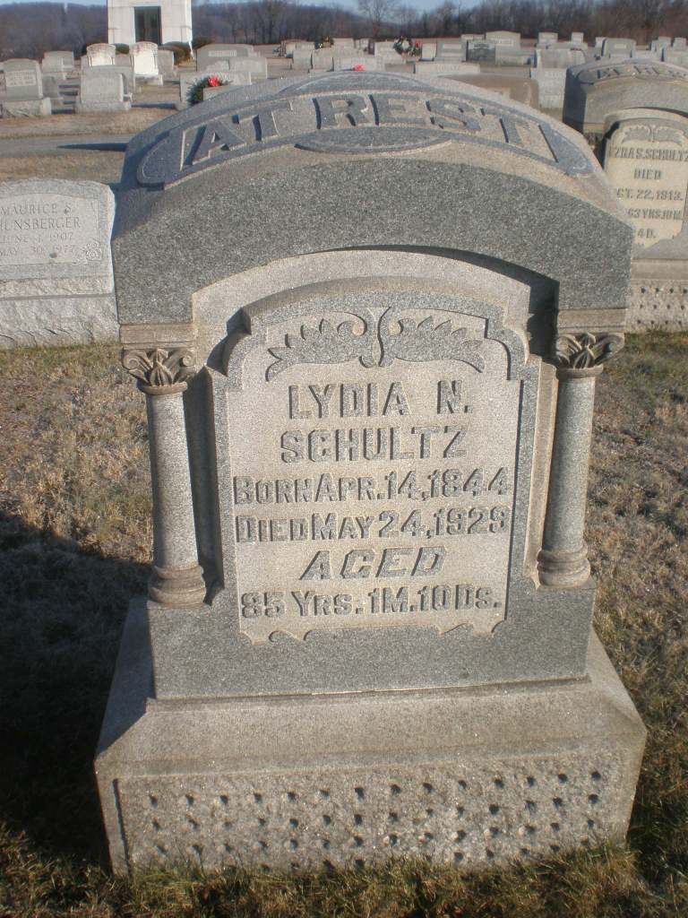 Lydia (149-76) was born on April 19, 1844 and died on May 24, 1929 at the age of 85. She married Enos Schultz, and they are both buried at Palm Schwenkfelder Church.