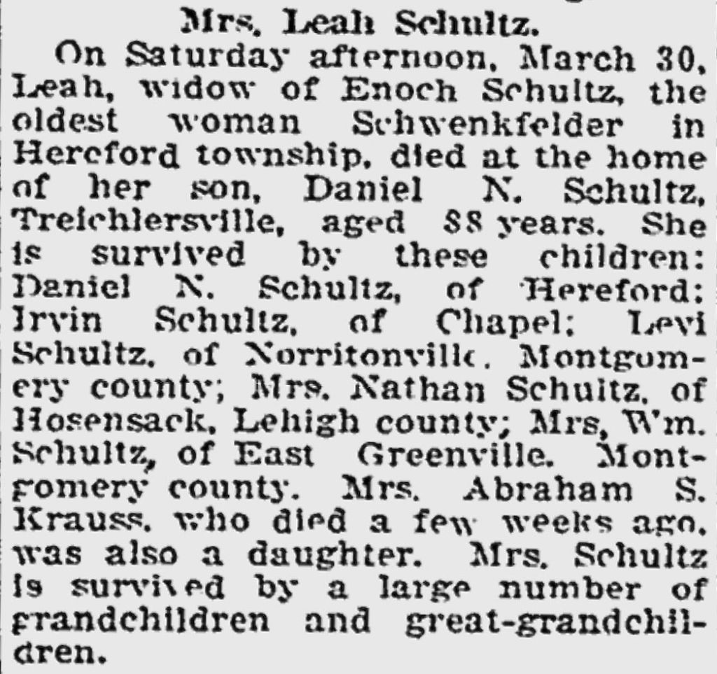 Mr. Schultz was born in Hereford township, Berks County, on November 9, 1865, a son of the late Enoch and his wife Leah, nee Schultz, Schultz, and resided on the old Schultz homestead all his life.
