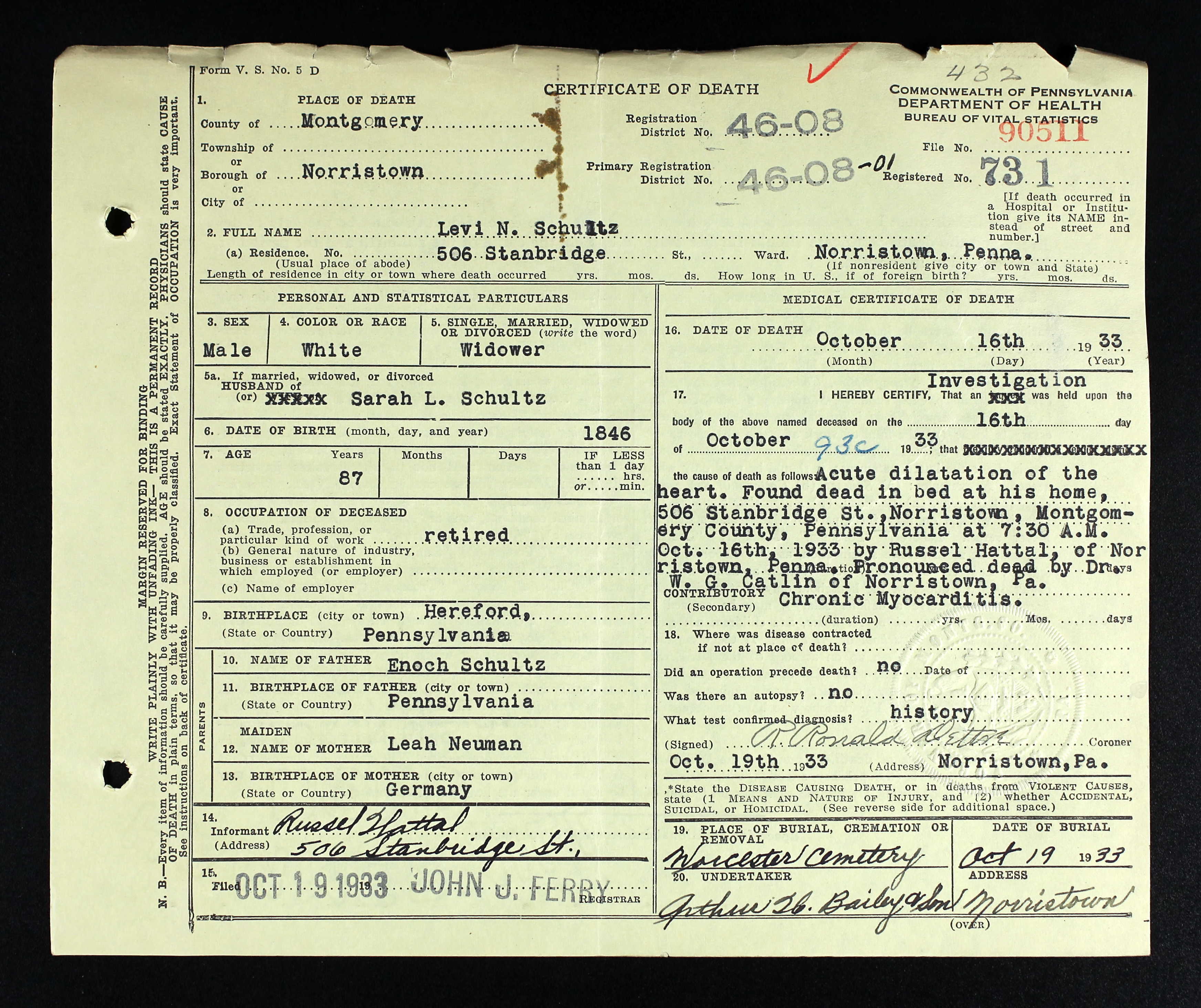 Mr. Schultz was born in Hereford township, Berks County, on November 9, 1865, a son of the late Enoch and his wife Leah, nee Schultz, Schultz, and resided on the old Schultz homestead all his life.