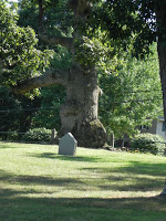 After a tour of the church building, which has many glass cabinets of old church memorabilia, we traveled a few miles away to where the original building once stood. At the edge of the road stood an immense tree – I’ve no doubt that it was there when “Elder Thomas” built the original church in 1737. In the green lawn behind the tree is a stone monument to the original church. And behind that lawn is a surprisingly large and old cemetery.
